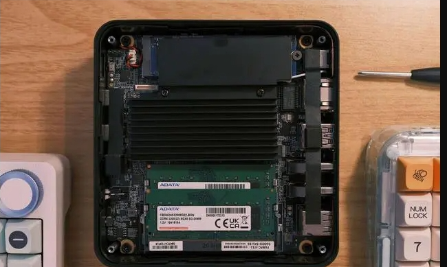 官方有准系统和16+512GB、16+1T 三种配置,给孩子用的话个人推荐16+512就足够了,自己用啊,如果你稍微懂点装机那就买准系统,现在硬盘真的是白菜价,内存条也便宜的很,自己组装当然价格更实惠。以16+512为例,打开机器后,能看到内存条是双通道,威刚的DDR4-3200MHz 8G内存条,两条。然后固态硬盘居然安装了大面积金属的这种散热马甲,这个好评,是吧,然后硬盘下边是这个联发科的RZ608,有条件的建议换成英特尔的AX200或者210,原因嘛,玩黑苹果的应该懂,待会再说。