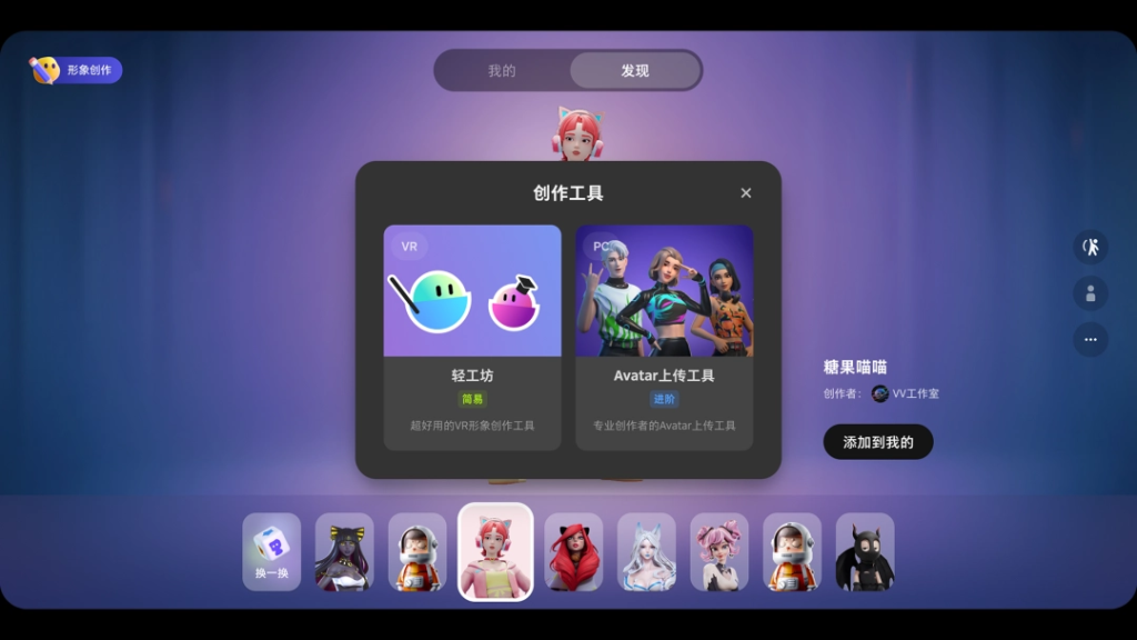 创作者也可以在 PICO 官方应用 “轻工坊” 内直接 VR 在线创作,创作完成后可在 PICO Avatar 形象中心一键发布。