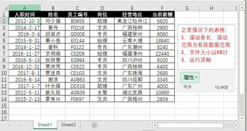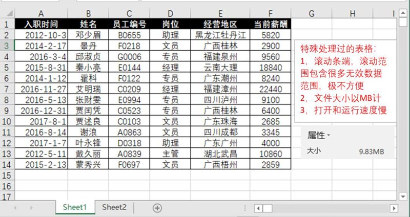 举个例子,有些人会通过填充公式或格式到不使用的行或列,形成非常多已使用的空白行或空白列,导致滚动条基本失灵,且 Excel 文件非常大,打开和运行效率都大大降低,表格使用者的工作效率降低了,就能在一定程度掩盖可能暴露的问题,这种手段可谓用心险恶。