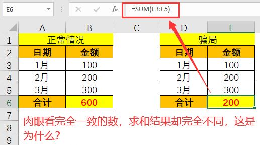 这是因为,E4 单元格使用了自定义数字格式,而 E5 单元格实际上是文本型数字,简单两招,就足够以假乱真。