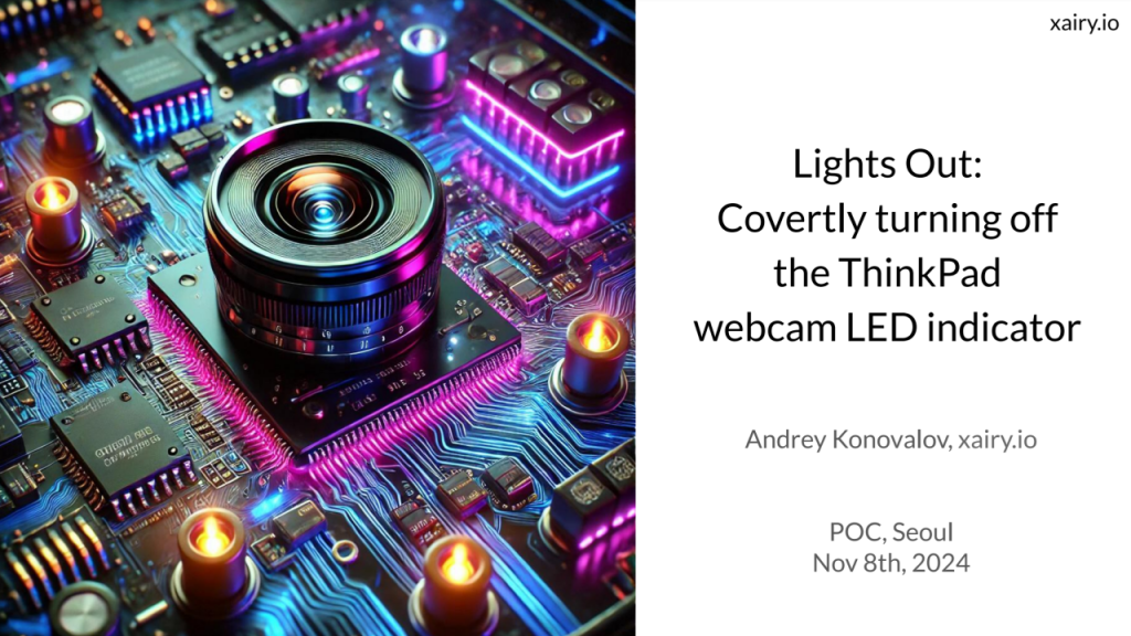 摄像头 LED 指示灯本质上是摄像头组件的固件驱动的,既然是固件那就有可能会被篡改,Andrey Konovalov 在上月举办的 POC 2024 安全会议上介绍了如何秘密关闭 ThinkPad 摄像头 LED 指示灯的方法。