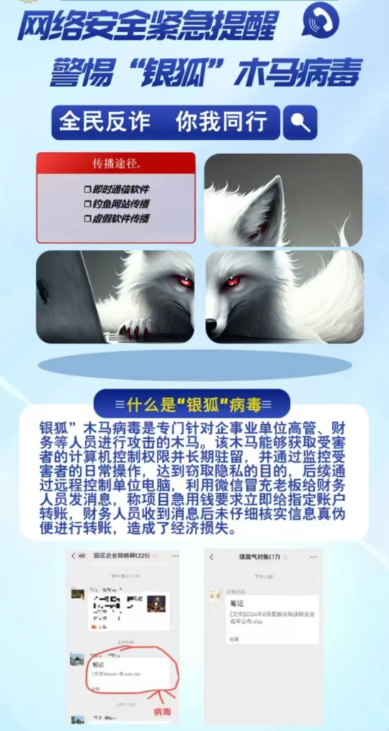 “银狐”木马是专门针对企事业单位管理、财务、销售等从业人员进行攻击的木马。该木马能够获取受害者的计算机控制权限并长期驻留,并通过监控受害者的日常操作,达到窃取隐私的目的,为后续实施诈骗等行为铺路。同时,该木马会冒充受害者的身份,在微信群内进行更广泛的传播。