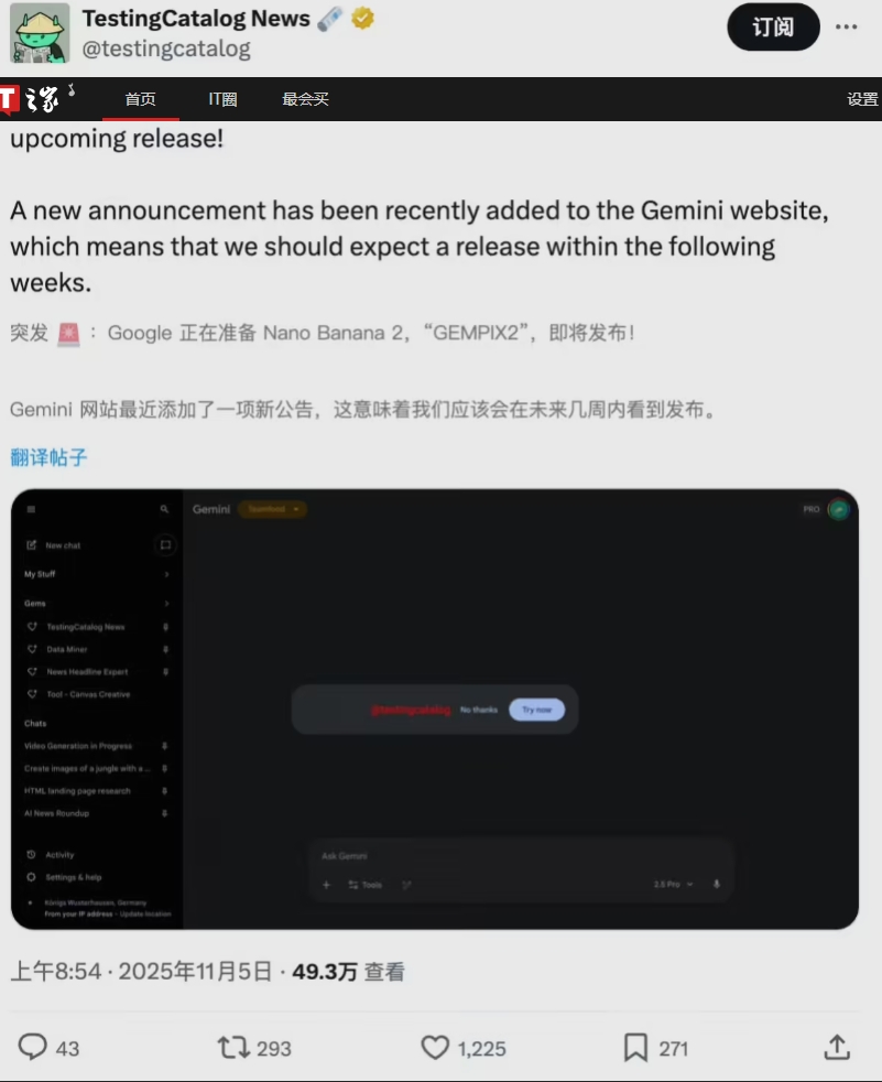 谷歌最强 P 图模型升级,爆料称 Gemini 3、Nano Banana 2 即将陆续推出